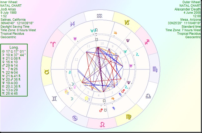 This is Jodi’s chart against the time of the murder as best I know it on 4th June 2008. You can see the transiting Nodal axis exact to within one second of a degree making a half return to her Nodal Axis, i.e. South Node to North and visa versa indicating a fateful turning point in her life. At the same time, transiting Chiron was conjunct the transiting North Node and opposing her natal North Node, square to Uranus, trine to Pluto and trine to her natal Mars creating a temporary grand trine. Also transiting Mars was making a square to her own Chiron and Ascendant conjunction. Here we have a wound (Chiron) being healed through anger and rage (Mars) in a unexpected, shocking event (Uranus), through violence and brutality (Pluto) to her former lover (Venus). Remember trines allow events to happen and oppositions can cause huge tension and animosity .