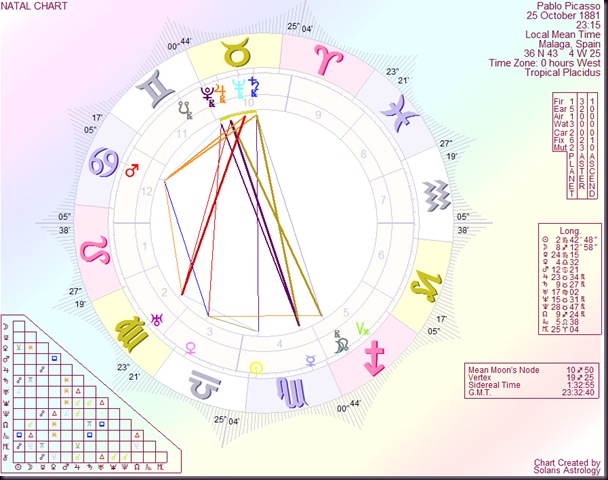 Saturn makes a square to Mercury in Sagittarius and an opposition to Neptune in Virgo forming a powerful t-square. This is a mutable t-square, and this type of configuration seems to effect the mental processes. At the point of the t-square is the planet ruling the mind, Mercury. The Astrologer Bill Tierney wrote that this type of formation is like a windmill in a gale, and you can see the ideas and images in Ridley’s mind whirring around at high speed. This is the formation that drives his creative processes. Saturn in Pisces as I have already explained, Neptune in Virgo adds the detail, perfection and skill to the filmmaking process, he will have an eye for detail, the visions (Neptune) he sees in his mind (Mercury) will be painstakingly transferred into solid form (Saturn) and then communicated (Mercury) around the globe to a wide audience (Sagittarius). Here we have the Sagittarian influence again. Ridley is known for epic blockbusters of wide scope. Neptune makes a mini grand trine with Jupiter and Venus. Here Ridley has a love of beauty, creativity, colour, mysticism, idealism, a generosity of spirit and a compassionate nature.
